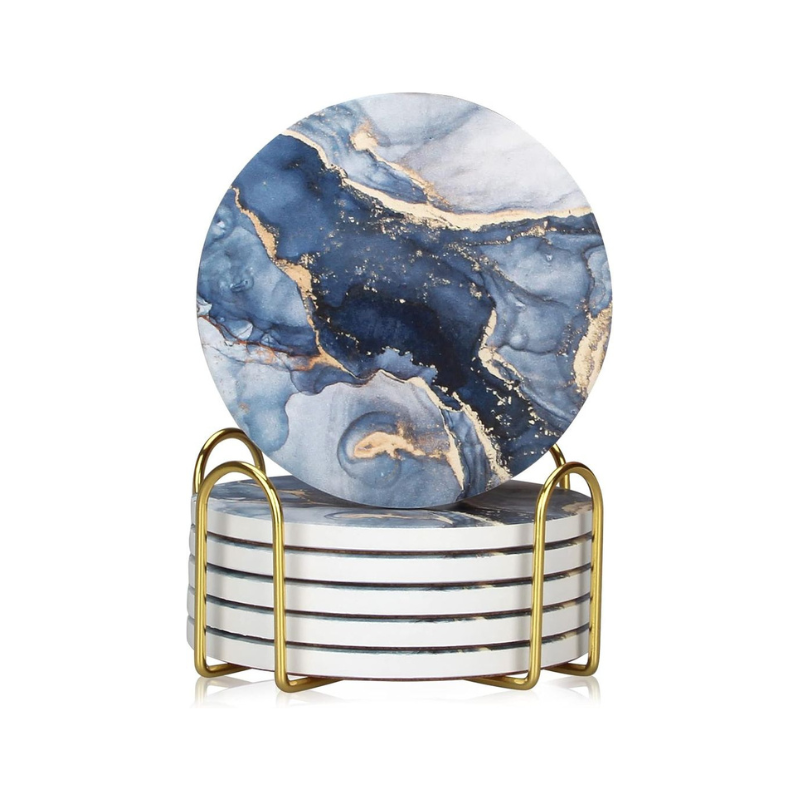 6 pcs Navy Blue Marble Abstract Ceramic Coasters with Holder