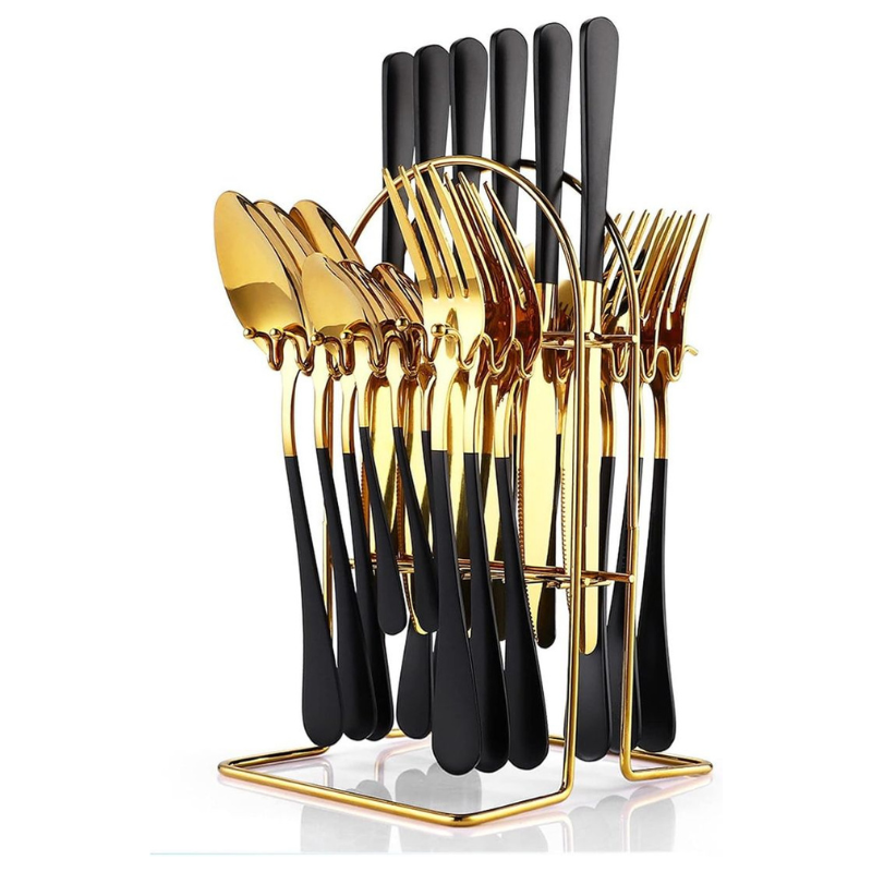 24-Piece Gold and Black Stainless Steel Cutlery Set with Rotating Stand